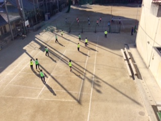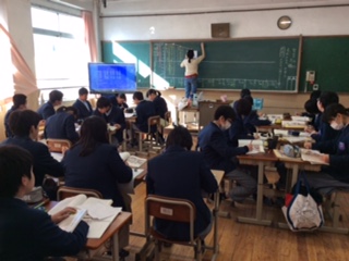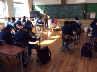 2年生授業の様子。2組は体育で、サッカー。楽しそうでした。3組は国語で、走れメロス。メロスの心情グラフを書きました。4組は数学、場合の数と確率。コインやサイコロで学習しました。