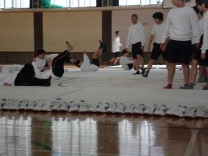 5時間目の1年生男子は、体育館で柔道の受け身を練習しました。