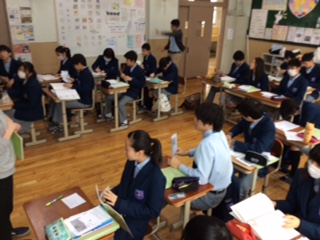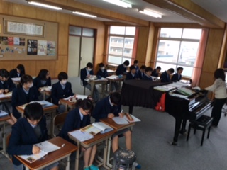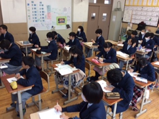 2年生授業の様子。2組は音楽、勧進帳から長唄について学習しました。3組は数学、コインを投げた時の確立について学習しました。4組は理科で、気象観測などについてノートまとめしました。