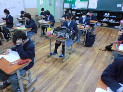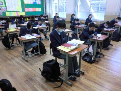 出席番号順の座席について、最後の学習の点検をしてテスト開始を待つ1年生の姿です。