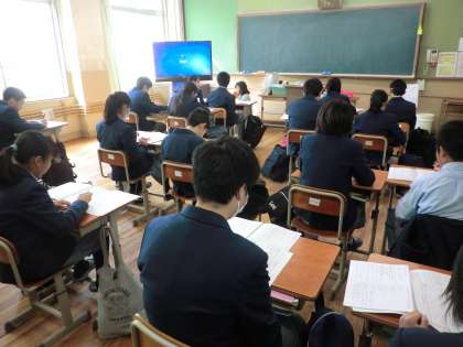 写真左:1年2組(国語)、写真中央:1年4組(理科)、写真右:1年3組(技術)