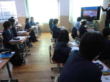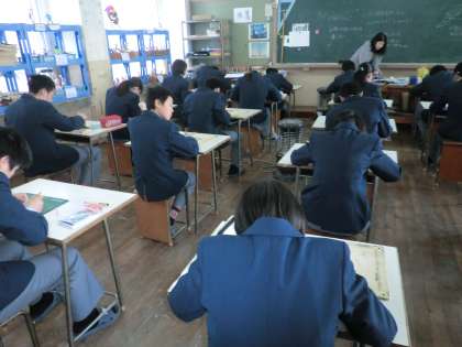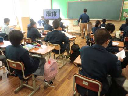 1−3は理科で「地震の震度」について、1−4は社会で「日本の範囲」の学習、1−2は美術で「ハンコ作り」を行っていました。