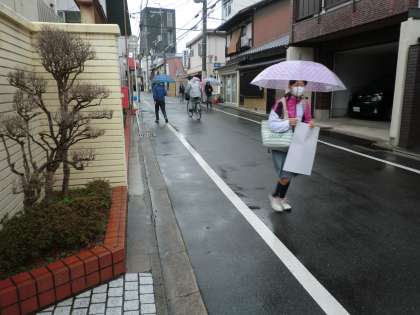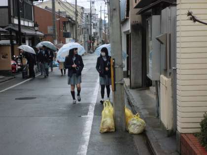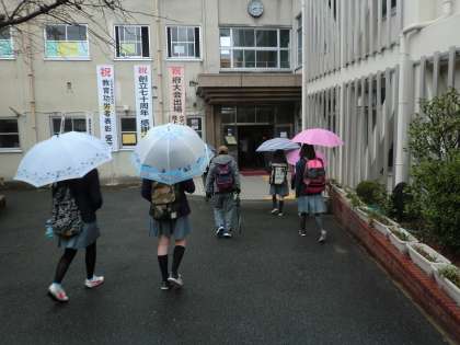傘をさして、登校してくる生徒たちの様子です。
