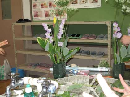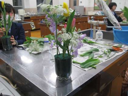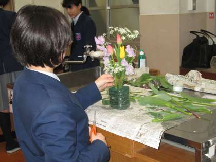 昨日の文化部女子チームは、華道をしました。今年度最後の活動は、フラワーアレンジメント。水盤に生けるのではなく、「オアシス」というアレンジメント用のスポンジを使って、洋風の生け方(?)をしました。