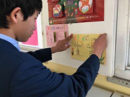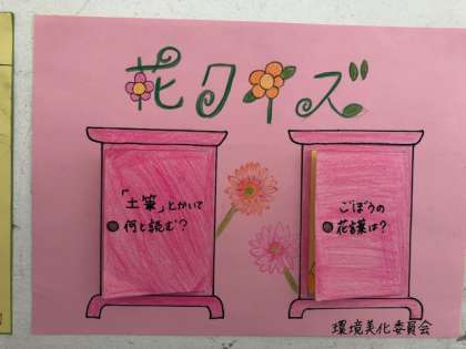 最終の専門委員会にて、87(花)クイズを作成しました。先日完成したクイズを専門委員長が各学年の廊下や階段に掲示してくれました。植物に関するクイズが書かれていて、扉を開くと答えが書かれています!ぜひ、ご覧あれ!!