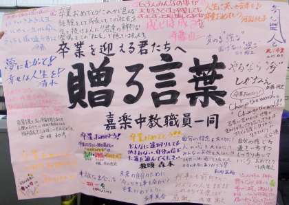 本日は、お子様のご卒業本当におめでとうございました。また、多数のご来校ありがとうございました。ここまで、3年間の教育活動を進めてこられたのも、ひとえに保護者の皆様のご理解とご協力があったからに他なりません。お子様だけでなく、あたたかく私達も見守っていただき、励ましのお言葉もかけていただいたこと、心よりお礼申し上げます。3年間本当にありがとうございました。これからのお子様の活躍、心より応援しています。