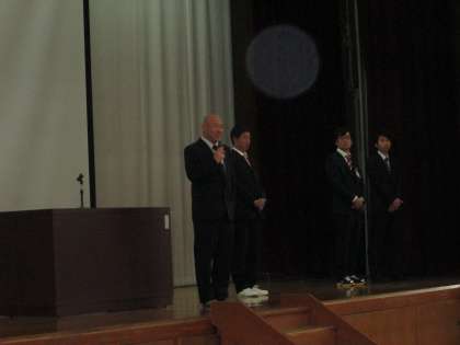まずは、新しい校長先生・教頭先生をお迎えしました。新校長先生のご紹介の下、新しく来られた先生方と対面しました。