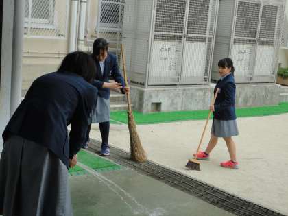 水まで撒いて本格的に掃除をしています。
