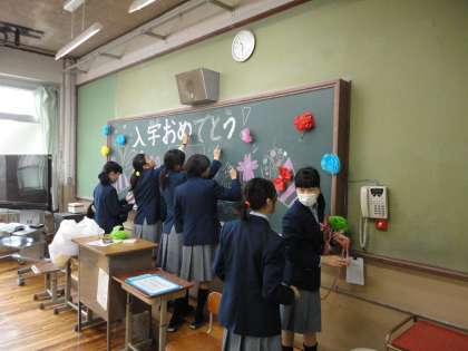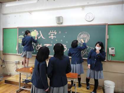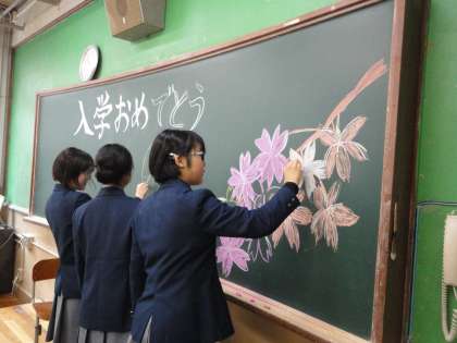 新入生の教室を掃除をしたり、黒板アートをしたり、