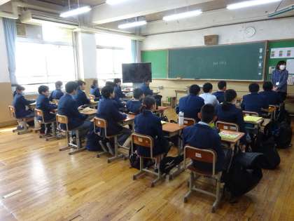 先生からの自己紹介を聞いています。