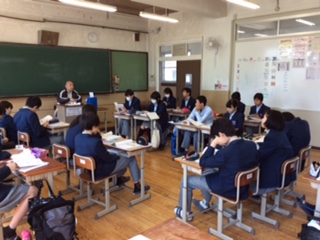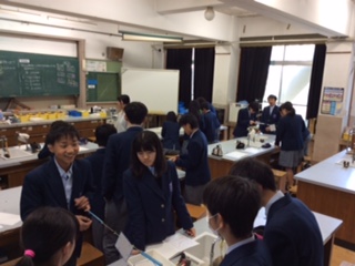 3年生、授業の様子。2組は数学でガイダンス。3組は理科の実験で力のつり合い、力がつり合う条件について検証。4組は英語、アクティビティや音読で使役のmakeについて表現できるようになりました。