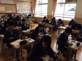 3年生授業の様子です。2組と4組は社会、歴史で日露戦争について学習しました。3組は数学で、乗法公式のカッコ外しを学習しました。