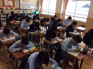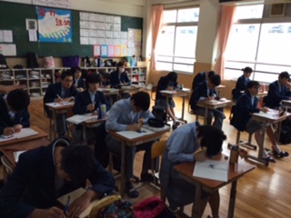 3年生授業の様子。2組は体育で、テニスのバックハンドを極めてました。3組は数学で、因数分解ドリルにチャレンジしました。4組は社会で、第一次世界大戦後の世界の動きについて学習しました。