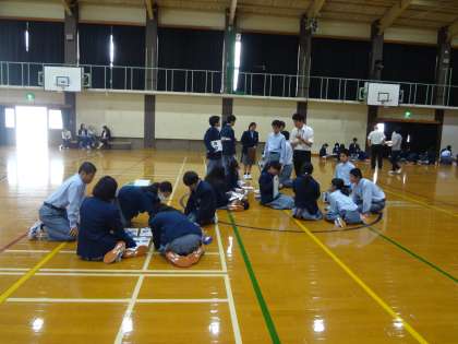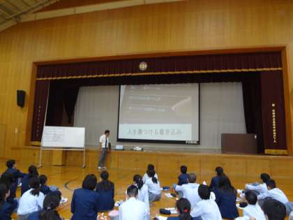 体育館で情報モラルについての学習の様子です。