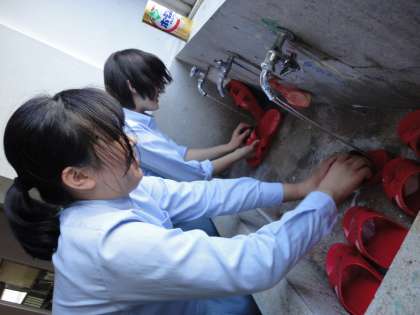 一人がトイレの掃除をしていたところ、「「スリッパ」が汚いから、トイレの床がすぐ黒くなるのでは?」と気付いてくれて、皆でスリッパを泡々にして洗濯しています。