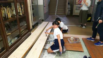 美術部は、ベンチのニス塗りを手伝っています。