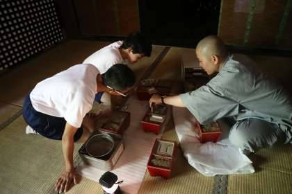 お仕事なのです。お寺の方の見本を身を乗り出して聞いています。