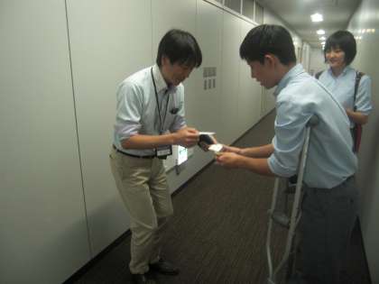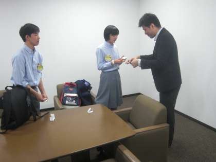 左の写真は、漢字ミュージアムで名刺交換の練習をさせてもらっているところです。