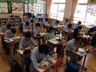 3年生、修学旅行から帰ってきました。旅行明けの最初の授業は、2組が社会で、中国統一の動きとその影響について学びました。3組が数学で、和と差の積は2乗ひく2乗、展開、因数分解を使い、問題を解きました。4組は体育で、テニスのサーブ練習をしました。