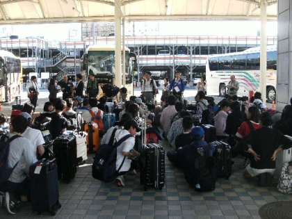 学校からバスに乗り、伊丹空港へ!朝早い集合にもかかわらず、みんなテンションあがっていました!空港に着いたら、諸注意を受け、大きな荷物を預けました!