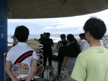 昼食のあとは、平和学習です。嘉数の丘では陣地壕、展望台、京都の塔の3か所に分かれて、語り部さんからお話を聞きました。みんな熱心にメモをとっていました。「京都の塔」は、再び戦争の悲しみが繰り返されることのないよう、また併せて沖縄と京都とを結ぶ文化と友好の絆がますますかためられるよう、切なる願いを込めて建立されました!この修学旅行で、沖縄の皆さんと少しでも絆が深まれば素晴らしいですね。