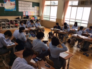 3年生の授業の様子。2組は家庭、幼児の成長、遊びを知る。小さいころの環境が大切であることを学習した。3組は国語、月の起源を探る。序論本論結論をわかり、小見出しに注目して読んだ。4組は数学、素因数分解して解いた。