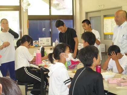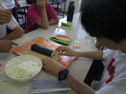 まずは、両校の生徒が挨拶をして交流開始。「手巻キンパ」作りに挑戦しました。