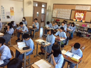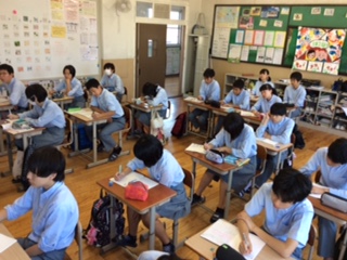 3年生朝一番授業の様子。2組は保健体育で、運動を一切行わなかったらどうなるか学習しました。3組は数学でルートの計算、かけ算とわり算を学習しました。4組は社会で、アジア・太平洋での戦争を学習しました。