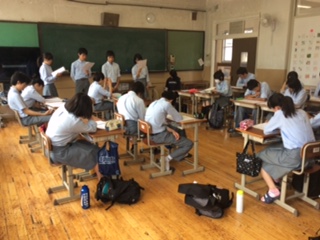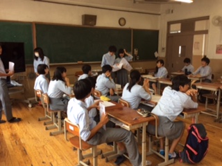 3年生の学活。生徒総会の為の議案書検討を行い、各学級で学級要望を協議し、学級目標発表の練習をしました。