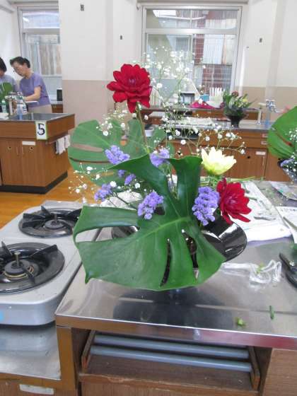 今日の花材は、ダリヤ・かすみ草・スターチス・モンステラでした。モンステラという大きな葉っぱは生けにくかったようで、結構みんな苦戦していました。