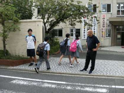 今朝は気持ちのいい晴天に恵まれました。少し肌寒い感じもしますが、みんなはいつも通り、元気に登校しています。