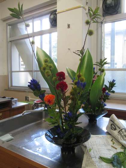 「前から見て一番美しい」ことと「生き生きと生命感がある」ことが、生け花であっても感じられるように、ということを教えて頂きながら生けてみました。