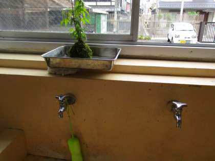 手洗い場に、PTAの行事で作成した、こけだまがいい風に吹かれています。
