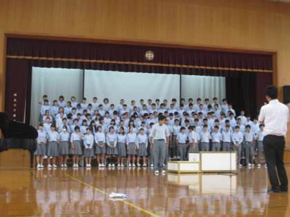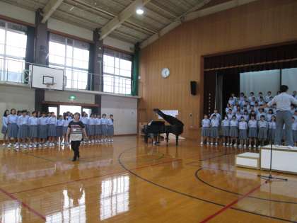 小中で歌う「翼をください」から始まり、各学年で取り組んでいる歌を、本番を想定しながら練習しました。