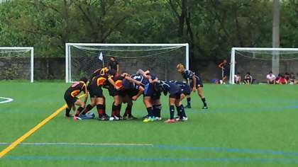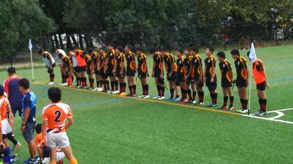 今年度から,土のグランドから人工芝にリニューアルした吉祥院グランドを会場に,3年生にとっては最後となる夏の大会が始まりました。予選最初の相手は洛南中との一戦です。スクラムで相手のゴール近くまで押し込む場面もあり,応援席ではすごく盛り上がっていました。次の試合も頑張れ!!