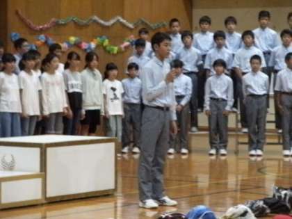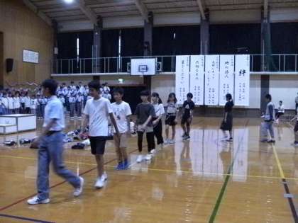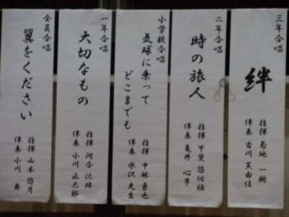 大きな拍手に迎えられ、小学生が入場しました。生徒代表(中3生)のあいさつで、交歓会が始まりました。体育館横には、各学年の合唱曲と指揮者・伴奏者の懸垂幕が飾られ、会場は合唱交歓会の雰囲気に包まれていました!