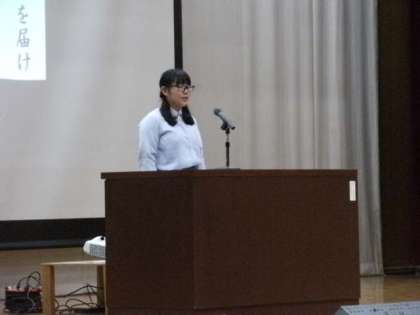 「今の自分と将来のこと」、「理想の自分と将来の夢」という演題で、発表してくれました。二人とも、今の自分としっかり向き合いながら、少しずつ将来に向けて着実に歩んでいきたいという強い気持ちが伝わる内容となりました。