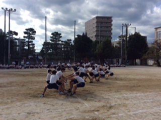 3年生招集待機、騎馬リレー、一文字綱引きの様子です。