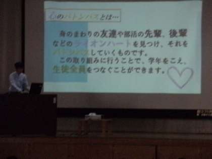 まずは「心のバトンパス」です。みんなのいいところ(ライオンハート)を学年をこえて、バトンパスして(広げて)いこうという取組です。お互いにいいところを認め合う、大切なことですね。現在、60人弱まできました。ようやく全校生徒の3分の1です。ここから急ピッチで進めていきましょう。ご協力お願いします。