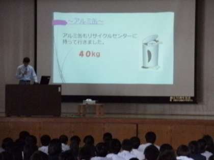 次に、ペットボトルキャップやアルミ缶回収の報告です。生徒みんなの日々の取組の成果ですね。これからも続けていきましょう!