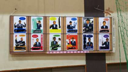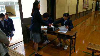 体育館の入り口では、投票券と引き換えに、選挙管理委員から投票用紙をもらいました。体育館に入ると、立候補者のポスターも掲示され、本格的な選挙の雰囲気の中、みんな真剣な眼差しで見つめていました。