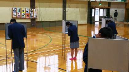 投票用紙を手に、記載台に向かいます。不正や無効票がでないように、選挙管理委員が見守る中、真剣に投票していました。