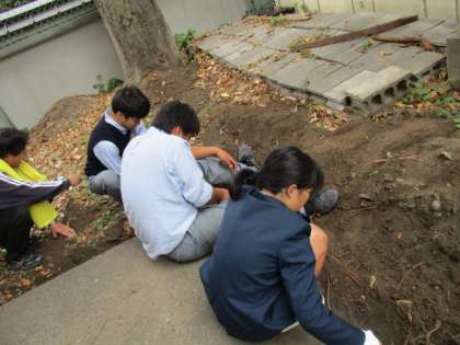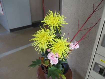 1組 作業をしています。木の根っこがすごい! 2組:美術 墨絵のようなタッチ、それぞれの味の出た作品になっています。すてきです。 生け花が職員室の玄関に生けられていますが、菊の花びらがどんどん開きます。美しいです。