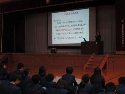 いじめを苦に自らの命を絶つ子どものことを扱ったニュースを耳にしない年はないほどに、子どもたちを取り巻く状況としていじめの問題は深刻です。先日も、京都市教育委員会から講師の先生をお招きして、「非行防止教室」の中でいじめ根絶に向けてのお話を聴いたばかりですが、それを復習するように校長先生も話して下さいました。