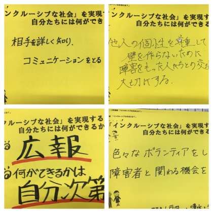 「固定的なイメージ(固定概念)というのは、なかなか変えられるものではないので、難しいことだと実感した」「色んな人とその想いを共有していくことでできないこともできるようになっていくので、人と人との関係を強くしていきたい」「障害者だからという考えよりコミュニケーションが大切ということが分かった」「今日の授業を受けて、日本には共生社会に対し、まだまだ課題があることが分かった」「体験で言ってはったように、ユニバーサルデザインも知らない人が違うように使ってしまったら、それはユニバーサルにはならないし、逆に不便なものに変わってしまうので、皆が、ユニバーサルデザインにもっと興味を持ち、どんな立場の人も使えるものや施設の在り方を理解していくことが大事だと実感した。もっといろんなことを知らないといけない。」「知られていないこと、知らないことだらけだと感じた。」
