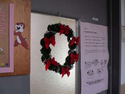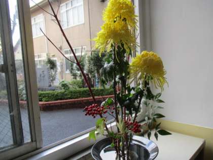 保健室の前の戸と1年生下足箱のところにある生け花の画像です。よく見ると生け花に何か加わっていますよ。何でしょう?