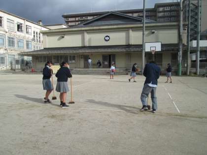 男子はサッカーを楽しんでいます。女子はボールを持っているものの、なぜかほうきも持っています。あ、なるほど!「ぐるぐるバット」をして遊びたいようです。