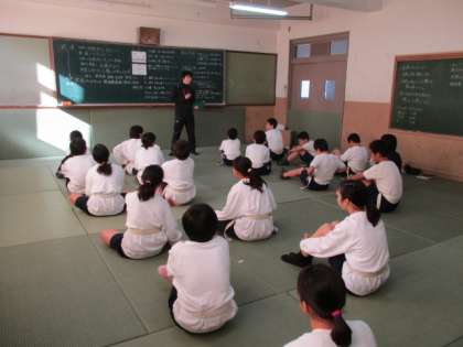 2組 体育 柔道の授業です。ノートについての連絡を聞いています。