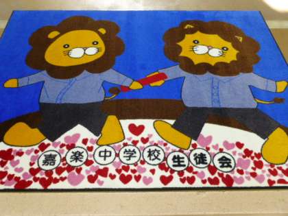新年を迎え、新しいフロア(ライオン)マットが完成し、南校舎入口に敷かれています。3年生の女子生徒(旧本部役員)が原画を描いて、他の旧本部役員のみんなも手伝ってくれました。本校のキャラクターであるライオン2頭がバトンパスしている様子をデザイン化してくれました。みんなのライオンハート(勇気や優しさ、熱い思い)を仲間や後輩に、また保護者や地域の方々につなげていこう(バトンパスしていこう)という思いを表しています。