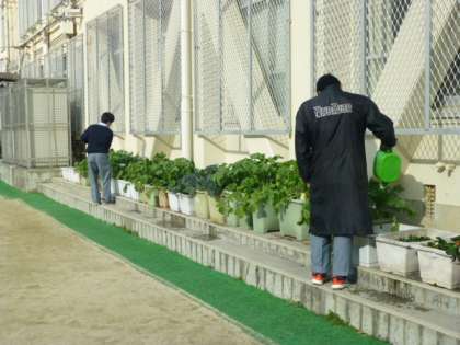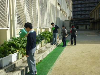 本日2限目の1組授業風景です。「生活」で、大切に育てている野菜のお世話です。もう間もなく収穫予定です。2月の上旬には、この野菜で収穫祭を計画中です。とっても楽しみです。